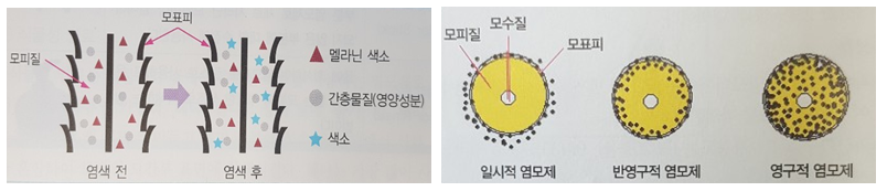 ⑥ 헤어컬러링의 종류 : 일시적 염색, 반영구적 염색, 영구적 염색, 탈색