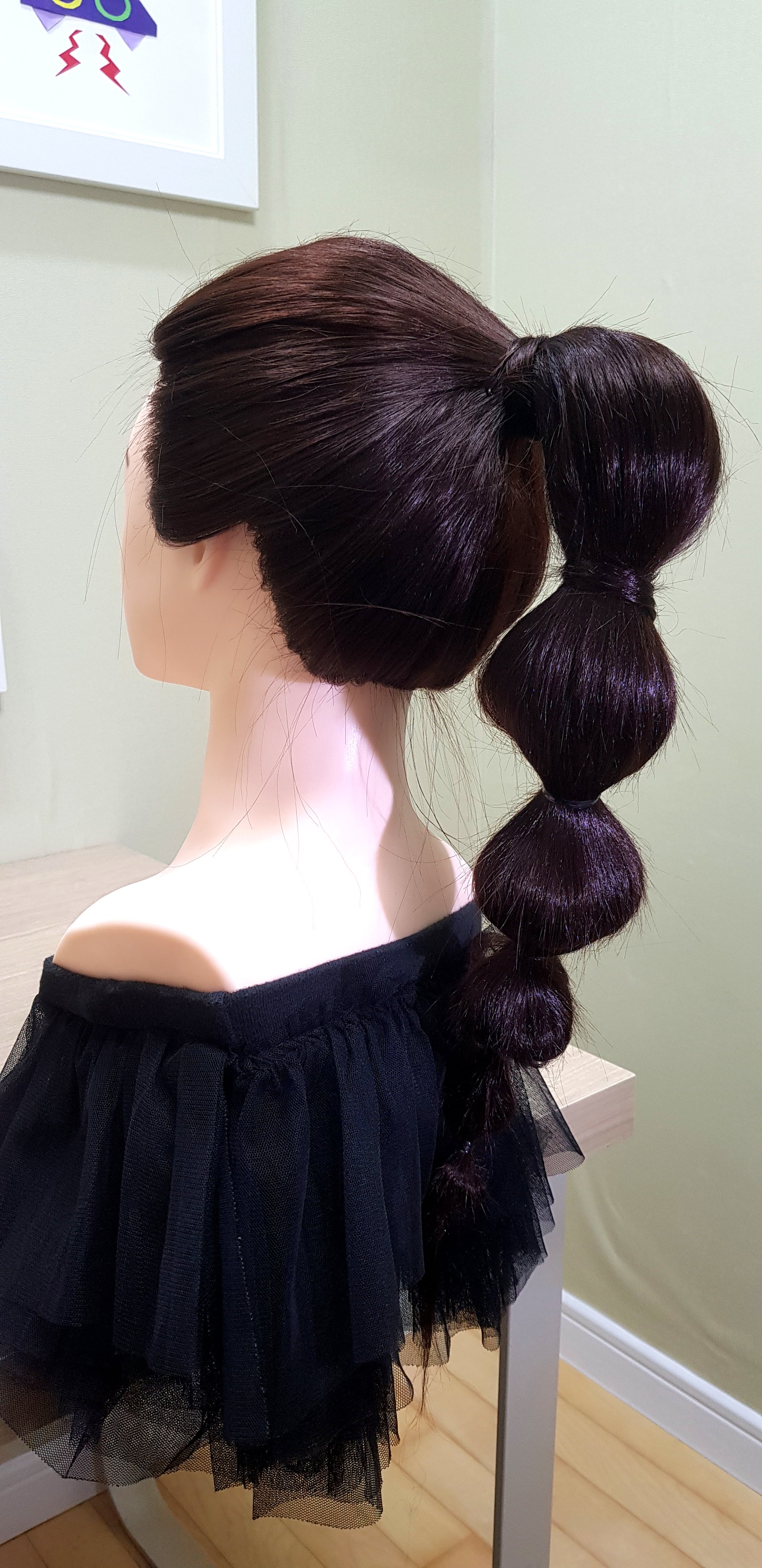 머리다발을 고무밴드 위로 둥글게 돌려준 다음 핀으로 고정하여 고무줄을 안 보이게 합니다.