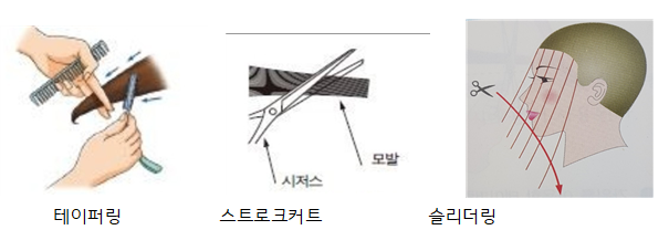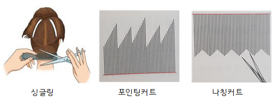 | 1) 커트기법 틴닝(숱 감소), 테이퍼링(붓처럼 가늘어지는 기법), 클리핑(삐져나오는 모발을 자르는 것), 스트로크커트(가위에 의한 테이퍼링), 싱글링(빗대고 개폐 동작), 트리밍(정돈), 나칭커트(45˚ 정도로 비스듬히 커트하는 방법), 포인팅커트(불규칙한 길이를 만들어내는 기법) 2) 헤어커트 시술 ① 원랭스: 자연각도( 0˚): 수평보브, 스파니엘커트, 이사도라커트 ② 그라데이션커트(45˚): 작은 단차가 생기는 커트 ③ 레이어커트(90˚이상): 많은 단차가 생기는 커트 |