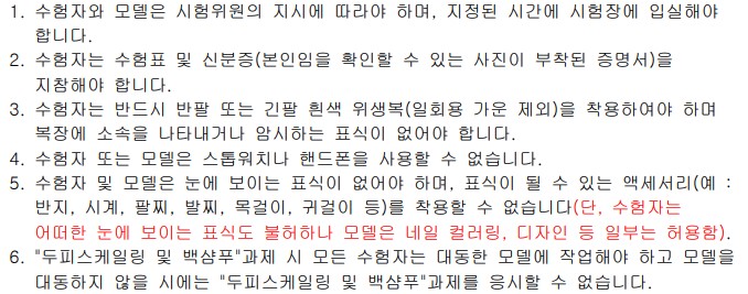 이전에는 수험자 또는 모델의 표식이 될 수 있는 규정이 많았지만, 2025년부터는 대동모델에 대한 표식의 기준이 완화 됩니다. 2025년 부터는 수험자는 어떠한 눈에 보이는 표식도 불허하지만 모델은 네일 컬러링, 디자인 등 일부는 허용됩니다.